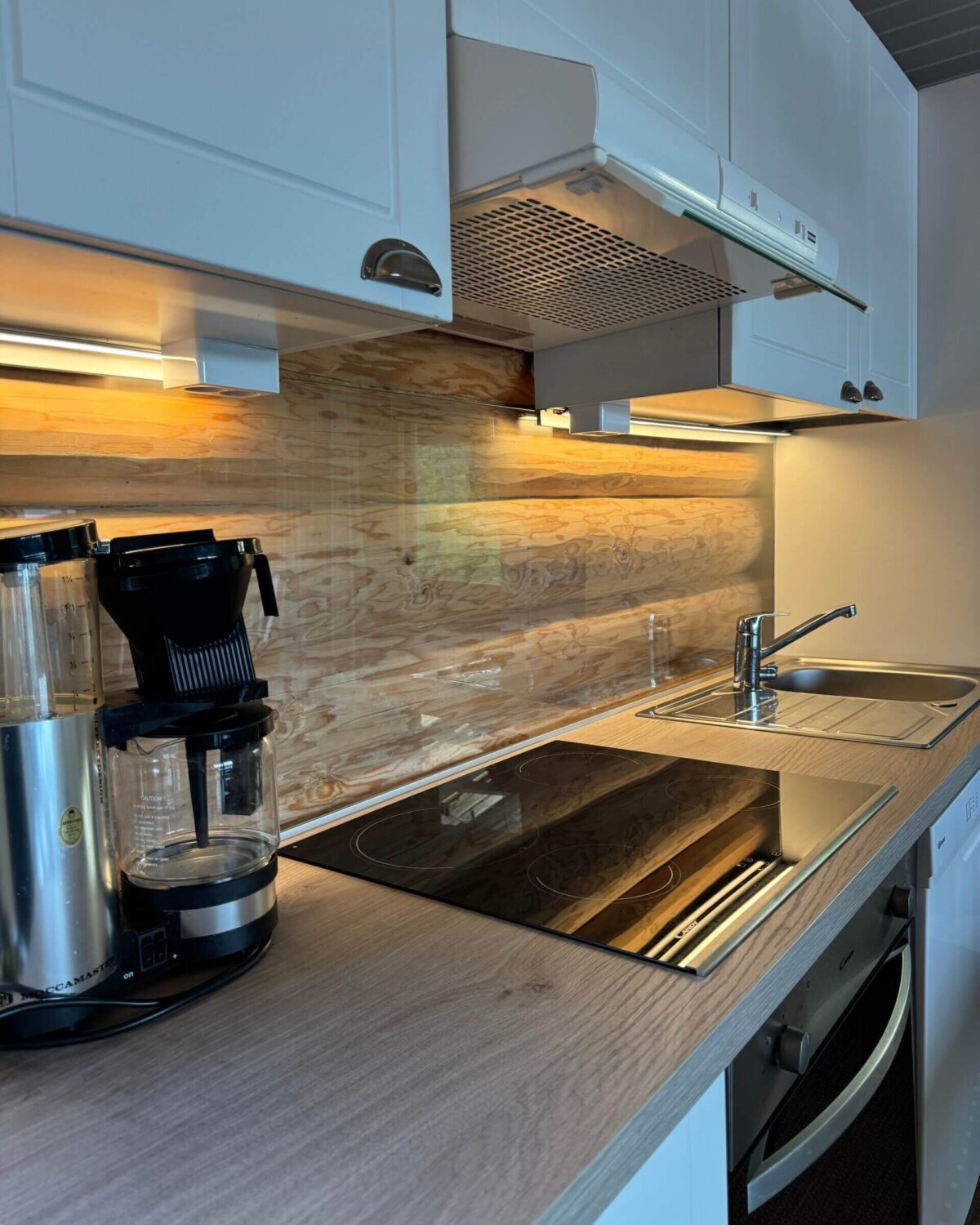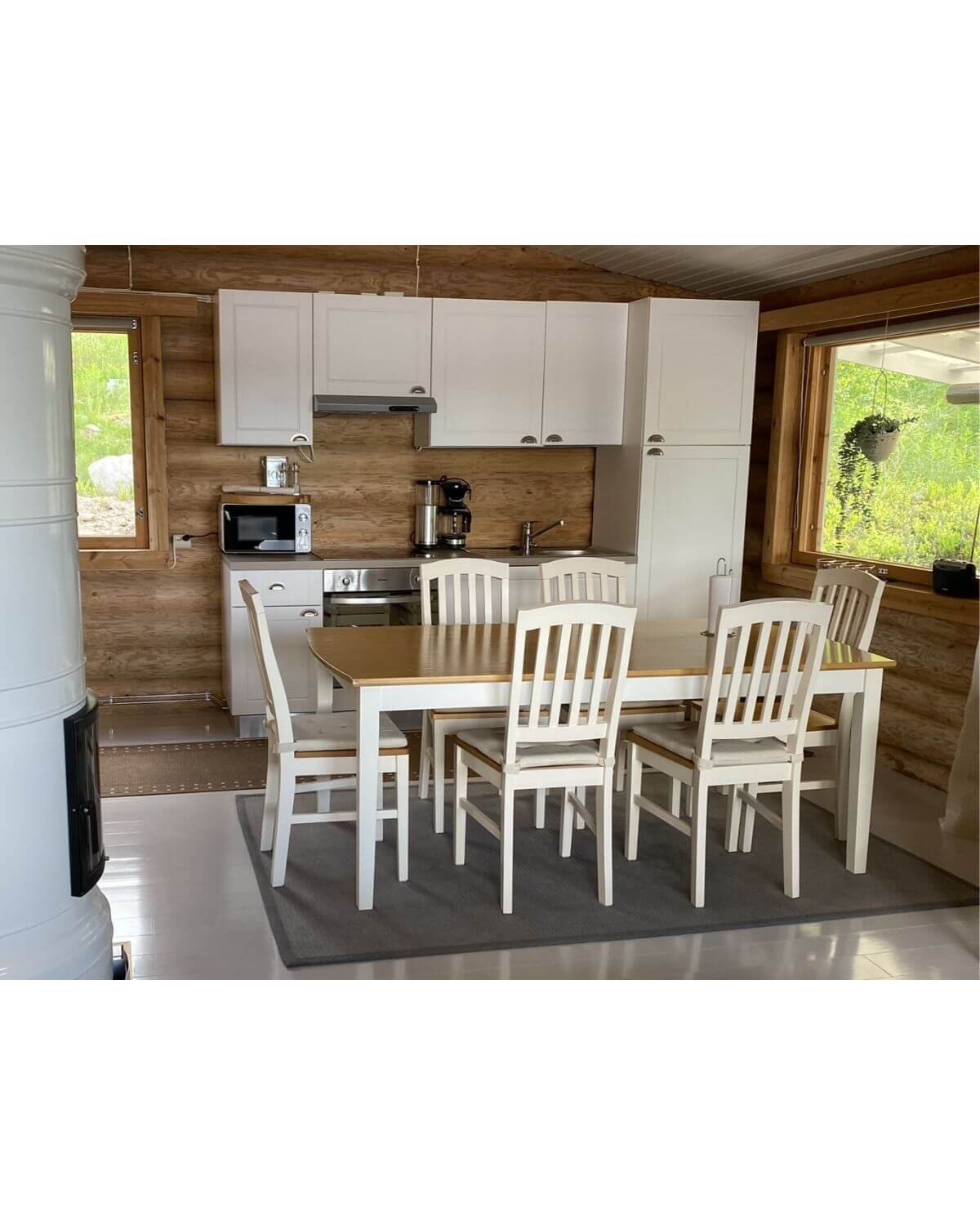 - Keittiö: porakaivovesi (juokseva kylmä ja lämmin vesi), jääkaappi pakastelokerolla, astianpesukone, keraaminen liesi ja liesituuletin, keraaminen uuni, mikroaaltouuni, kahvin- ja vedenkeitin, leivänpaahdin, astiat ja ruokailuvälineet. Ison pöydän ääreen mahtuu syömään kerralla hyvin 8 henkeä.