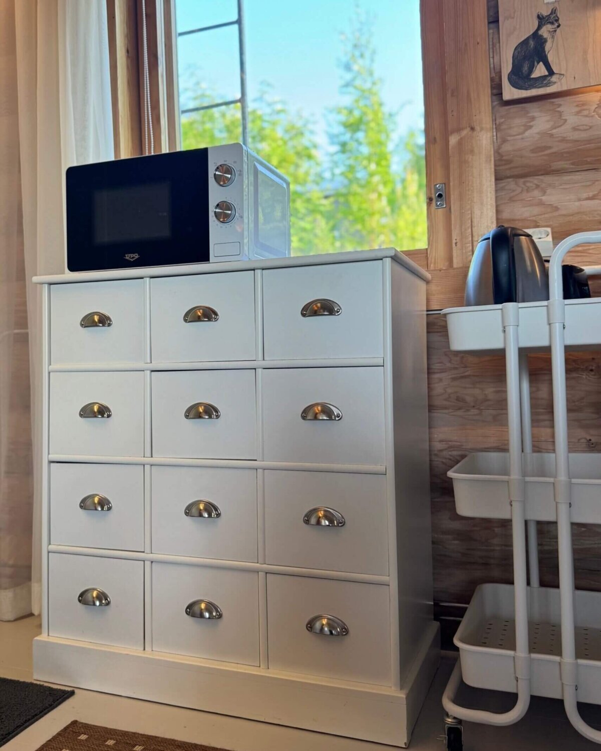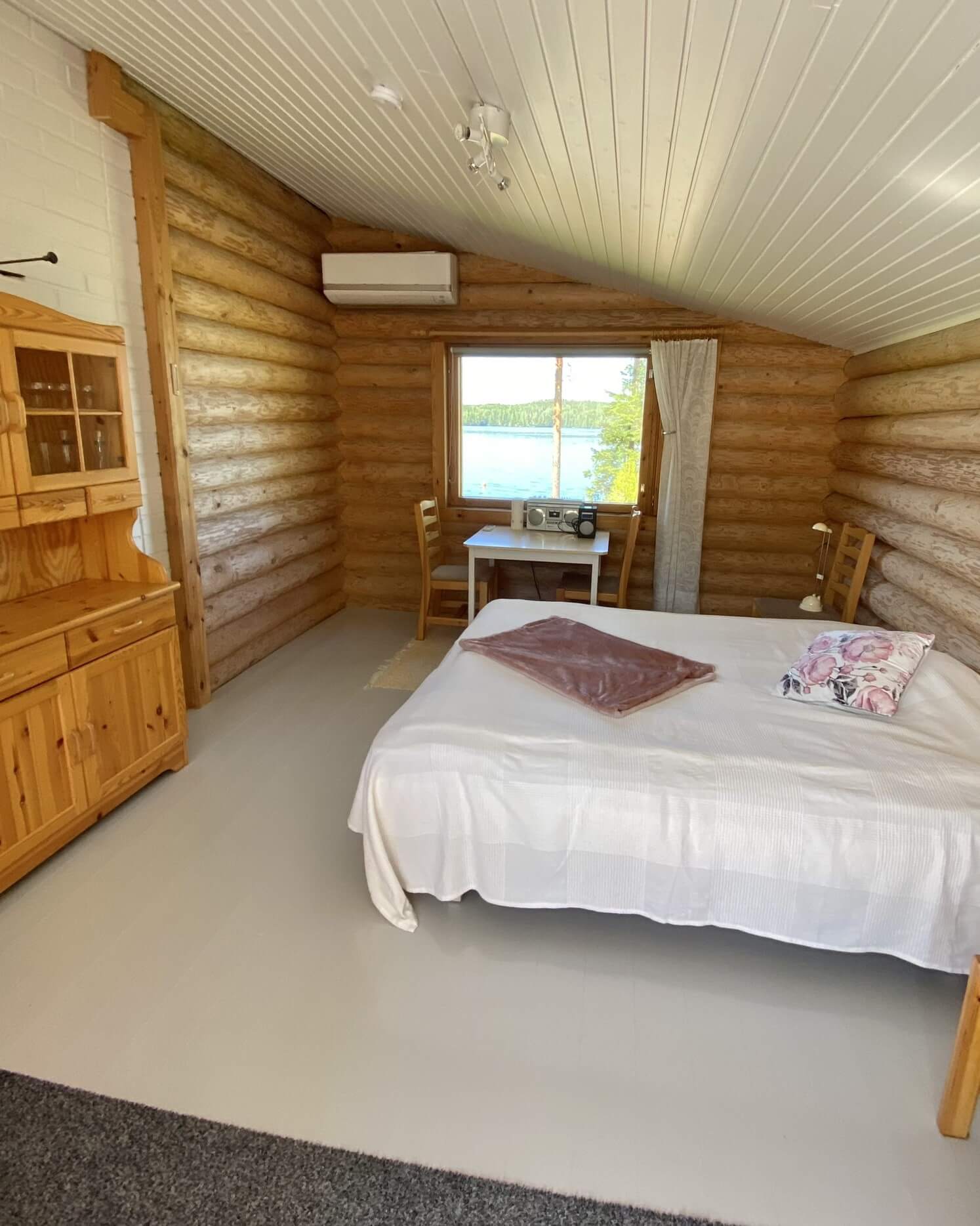 - Saunatupa: ilmalämpöpumppu, 160 cm leveä vuode (jonka saa jaettua kahteen osaan), pöytä ja tuoleja, astiakaappi, jääkaappipakastin ja pölynimuri.
