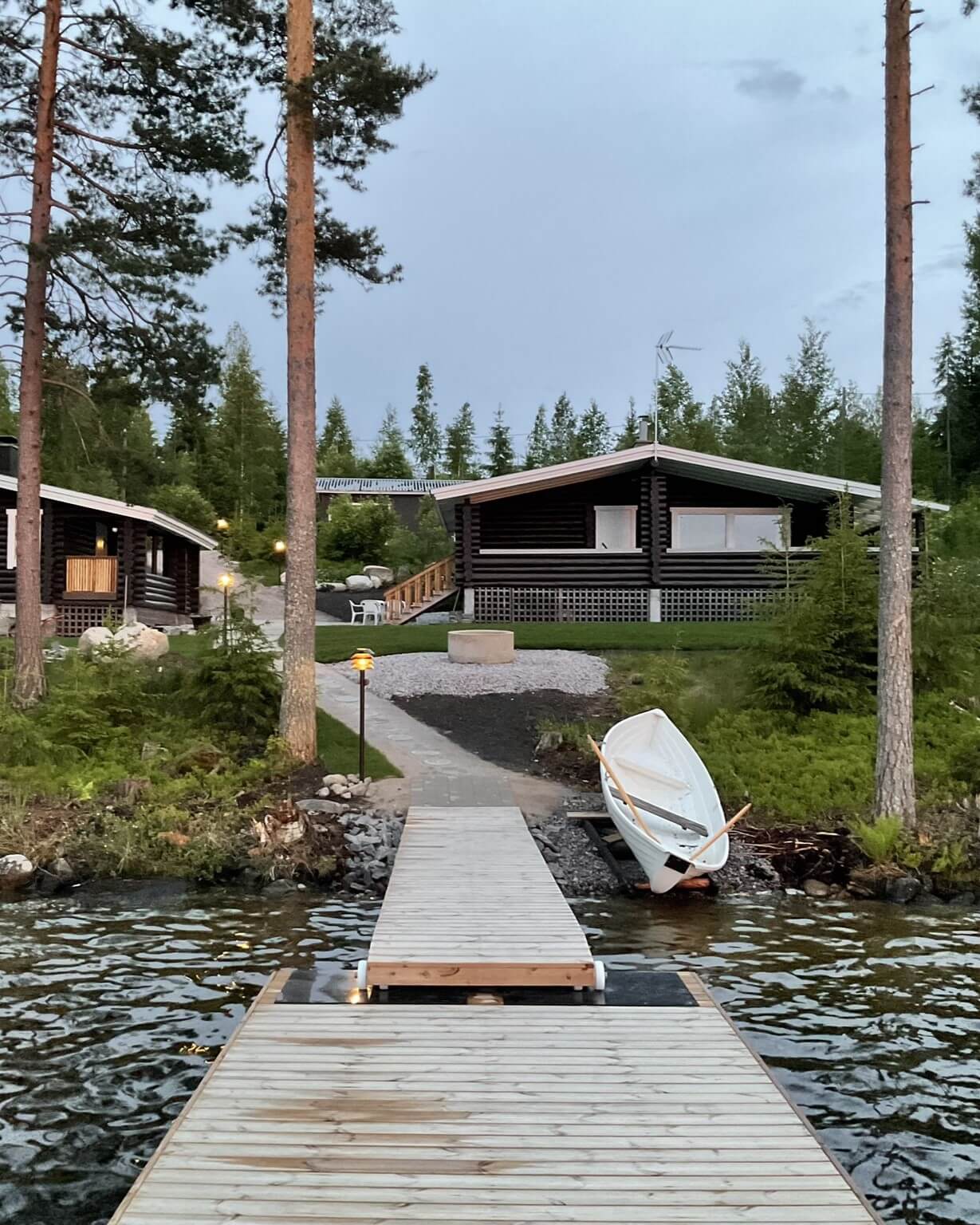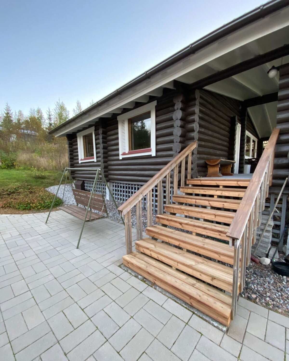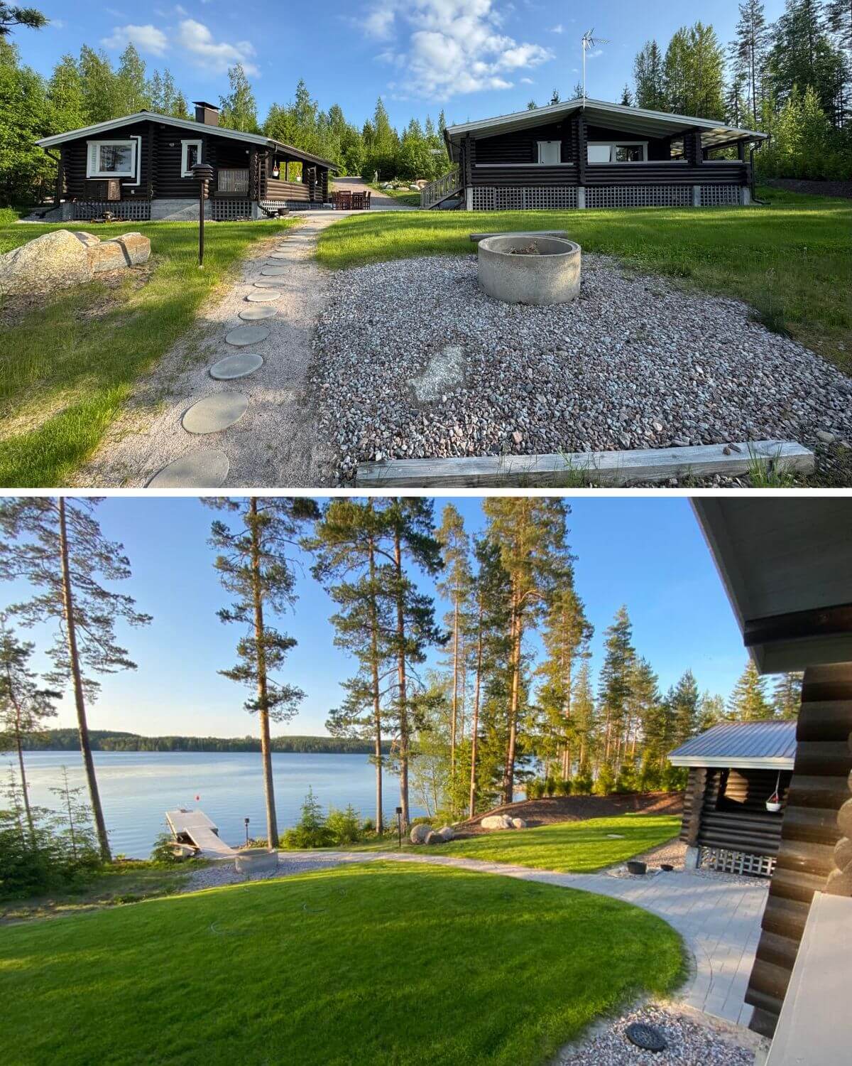 Päämökkiin noustaan portaita pitkin ja saunamökkiin on kaksi porrasaskelmaa.